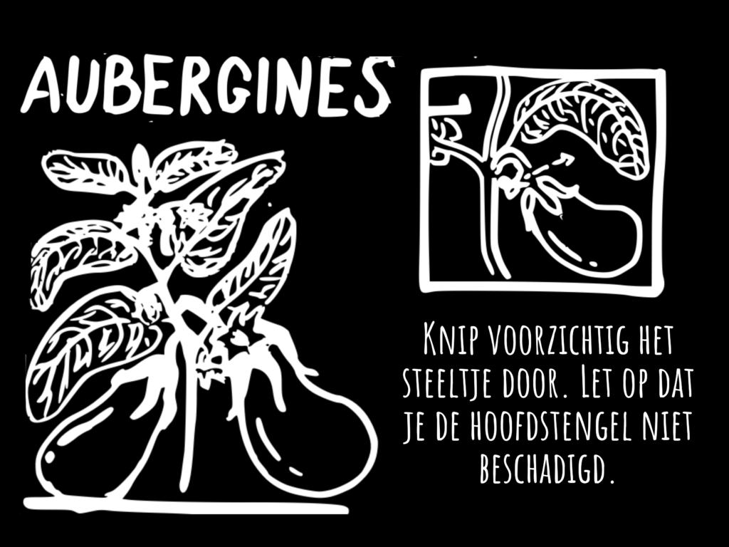 Zoek de grootste aubergine. Knip voorzichtig het steeltje door. Let op dat je de hoofdstengel niet beschadigd.