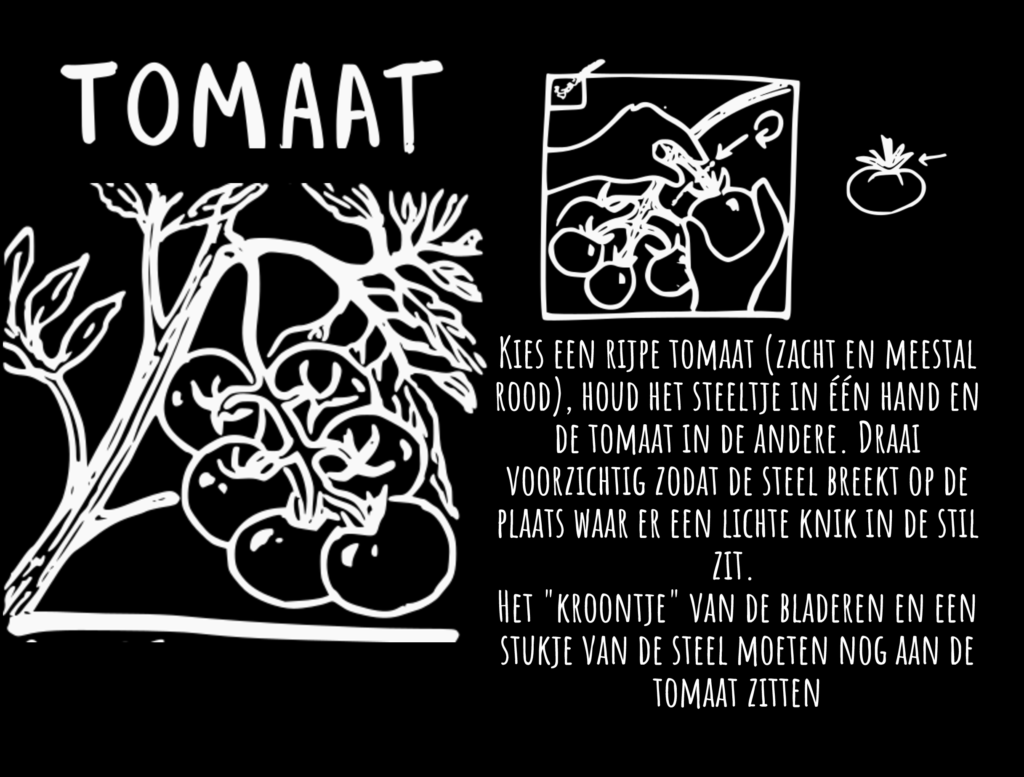 Kies een rijpe tomaat, houd het steeltje in een hand en de tomaat in de andere. Draai voorzichtig zodat de steel breekt op de plaats waar er een lichte knik in de stil zit.